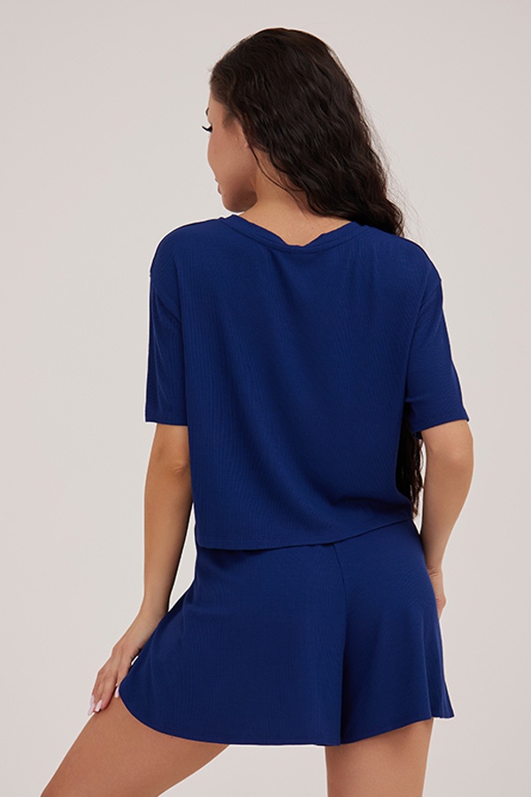 Описание Пижама из трикотажной вискозы состоит из футболки и шорт. Укороченная футболка широкого покроя, с короткими рукавами.Короткие свободные шорты на широкой резинке. Уход